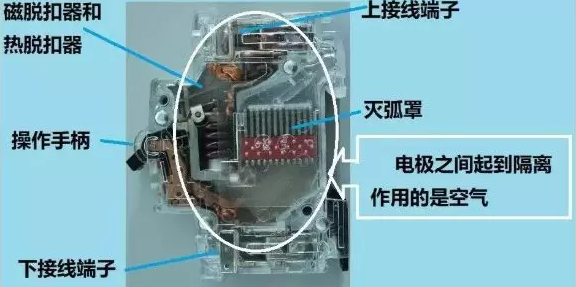 空氣開(kāi)關(guān)——斷路器屬于開(kāi)關(guān)的一種,所以“空氣開(kāi)關(guān)”又叫“空氣斷路器”。斷路器的滅弧方法有很多種,其中有一種方法是把電弧拉長(zhǎng),讓電弧在空氣中自然冷卻,直至熄滅。我們可以看看它的滅弧裝置(滅弧罩):