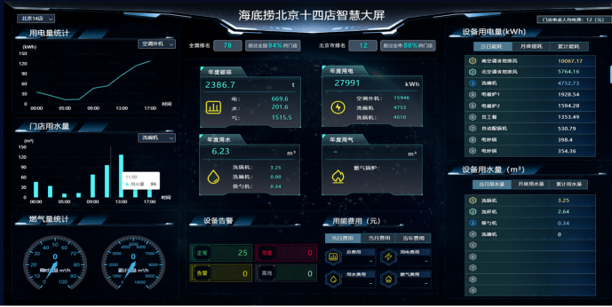 海底撈門店已實現碳排放的實時監測與自動化統計,通過動態采集門店的能源消耗數據(水、電、燃氣),自動換算為碳排放量,并生成可視化碳報表。不僅解決了人工統計的滯后性與誤差問題,更能為不同門店制定精準的節能降碳策略。