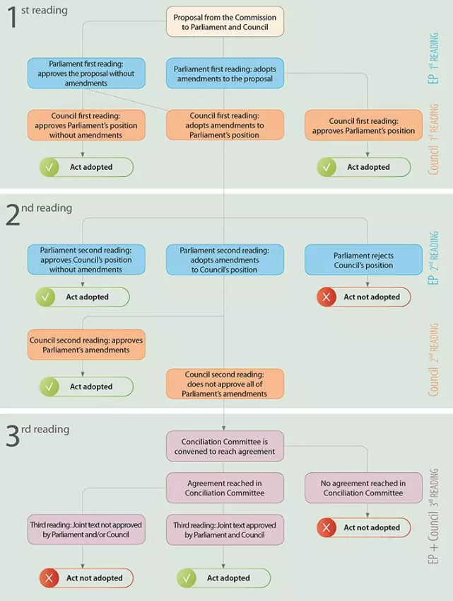 歐盟委員會提出法案后,歐洲議會將對提案進行“一讀”,“一讀”期間,歐洲議會對提案進行審議,可能通過提案或提出修訂。之后,歐盟理事會對提案進行“一讀”,理事會可與議會的立場保持一致,在這種情況下,提案將被通過;若理事會對提案提出修訂,提案將被退回議會進行“二讀”。“二讀”期間,議會將審查理事會的修改建議,若批準理事會的建議,則提案通過;若不通過理事會的修改建議,則整個提案立法程序終止;或者,議會再次提出修訂提案,提案將退回理事會進行“二讀”。理事會“二讀”期間將審查議會的二讀立場,若批準通過議會提出的修訂提案,則該提案通過;若理事會不批準修訂提案,將召開調解委員會(Conciliation Committee)來解決理事會與議會之間的分歧。由歐洲議會議員和理事會代表們所組成的調解委員會將嘗試就共同修正案達成協議。若未達成共識,則調解失敗,整個提案立法程序終止;若達成共識,則將其轉發給歐洲議會和歐盟理事會進行“三讀”[4]。據統計,85%的提案在“一讀”期間獲得批準,13%在“二讀”獲批,剩下僅有2%納入調解程序。