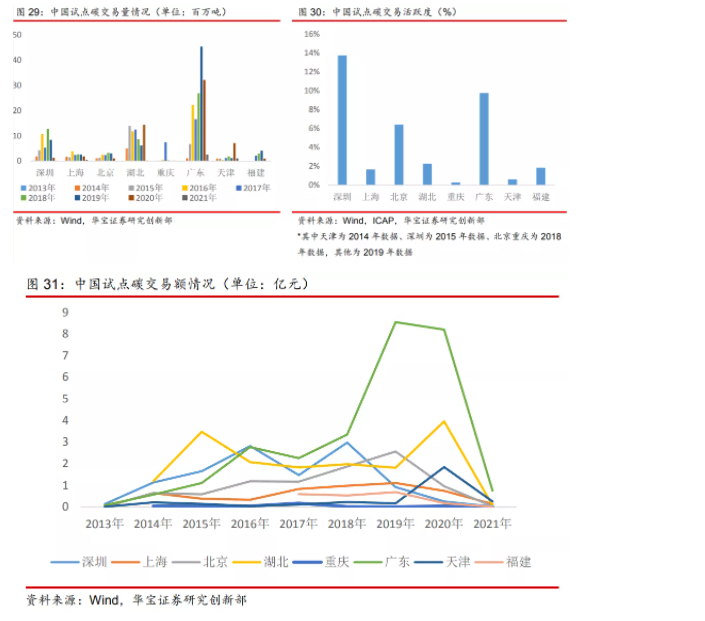 “全國統一碳市場將帶來千億級市場規模,”東方證券新能源分析師盧日鑫這樣估算。在碳排放交易量上,盧日鑫認為,我國目前碳排放總量超過100億噸/年,以2025年納入碳交易市場比重30%-40%測算,未來中國碳排放配額交易市場規模將在30億噸以上,與歐盟總排放量水平相當。在碳排放交易額上,盧日鑫認為,基于中國碳論壇及ICF國際咨詢公司共同發布的《2020中國碳價調查》的研究結果,2025年全國碳排放交易體系內碳價預計將穩定上升至71元/噸,全國碳排放權配額交易市場市值總規模將達到2840億元。按照目前設計規模預測,國融證券認為,全國碳市場市值可能達到1500億元左右,如若考慮到碳期貨等衍生品交易額,規??蛇_6000億元左右。其中,在碳配額遠期交易方面,根據劉杰的介紹,截至2020年底,上海碳配額遠期累計成交量達到433萬噸,并且幾乎每年都有穩定增長。格林大華期貨研究員紀曉云認為,以歐盟碳期貨交易量是現貨的30倍的標準測算,我國碳期貨的交易量可能達到4000億噸左右。以當前試點碳市場平均50元/噸的價格測算,碳期貨年交易額將達到20萬億元,體量上與橡膠、鐵礦石、銅等品種大致相當。目前,全國共有8個地區在開展碳排放權交易試點,截至2020年11月,各試點碳市場累計配額成交量約為4.3億噸二氧化碳當量,累計成交額近100億元。參與企業獲利嗎?
