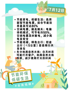 今年7月10日至16日為全國節能宣傳周,主題為:“節能降碳,你我同行”。7月12日為全國低碳日,主題為:“積極應對氣候變化,推動綠色低碳發展”。