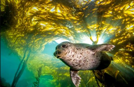 (加利福尼亞州圣巴巴拉附近豐富的水下森林中,一只斑海豹(harbour seal)從海帶樹冠上下來。圖源:Douglas Klug/Getty Images)