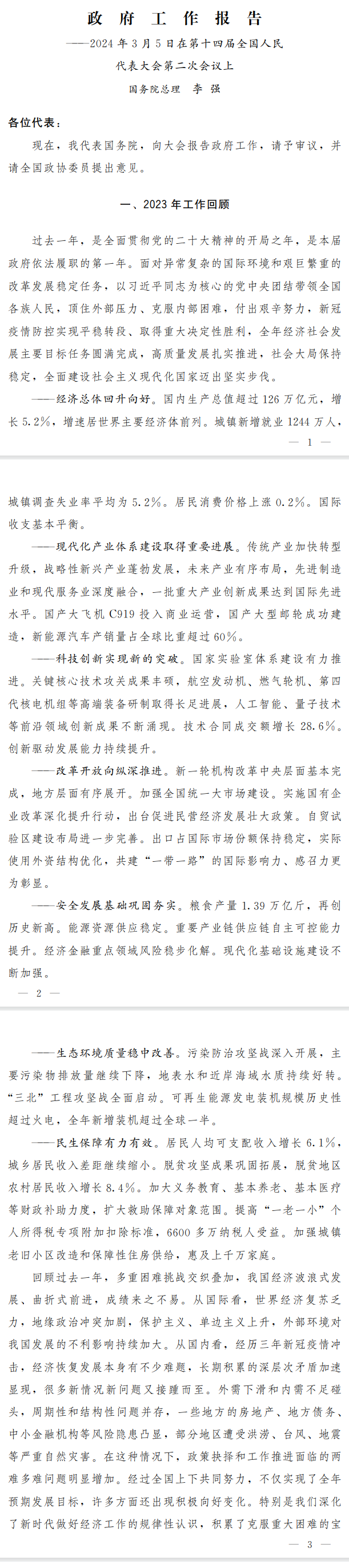 3月5日,第十四屆全國人民代表大會第二次會議在人民大會堂開幕,國務院總理李強向大會作政府工作報告。報告對2023年的工作作出了回顧,又對2024年的工作任務進行了部署。