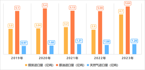 2019—2023年煤炭、原油、天然氣進口量