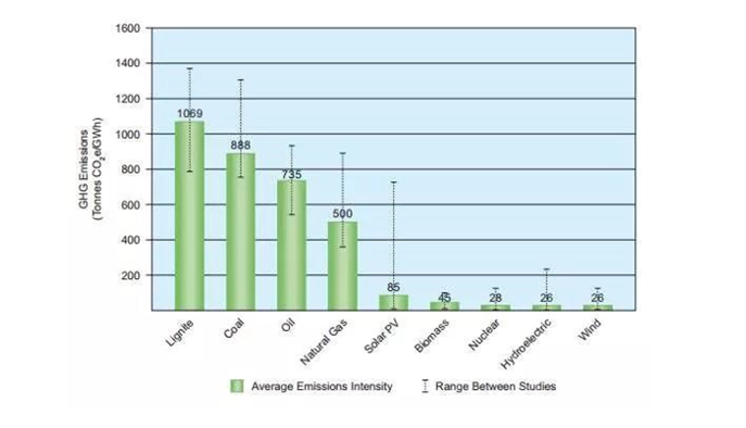 ——太陽能光伏排放強度中值為85克/千瓦時(最低13克/千瓦時,最高731克/千瓦時) ;