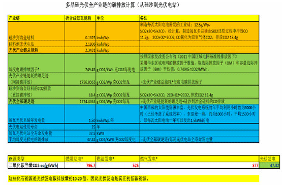 經計算,從多晶硅光伏全產業鏈(硅沙-光伏電站系統)來看,平均每度光伏發電的碳排放為47.32g CO2/kWh。