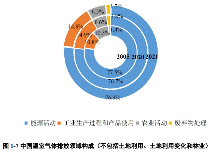 其中,能源活動溫室氣體排放為110.07億噸二氧化碳當(dāng)量,占比近76.9%;工業(yè)生產(chǎn)過程和產(chǎn)品使用溫室氣體排放為21.4億噸二氧化碳當(dāng)量,占比約14.95%。此兩項合計占比近92%。